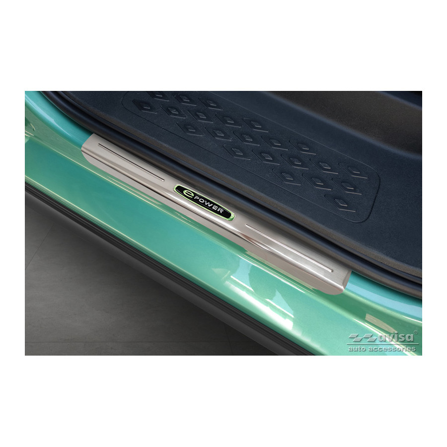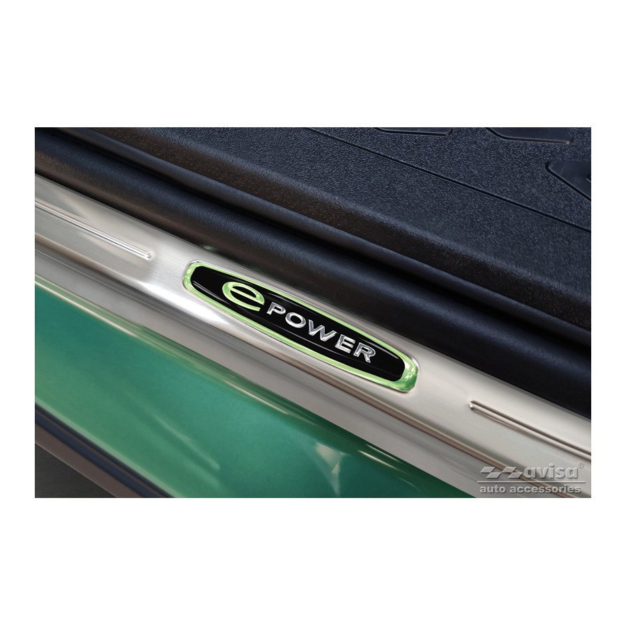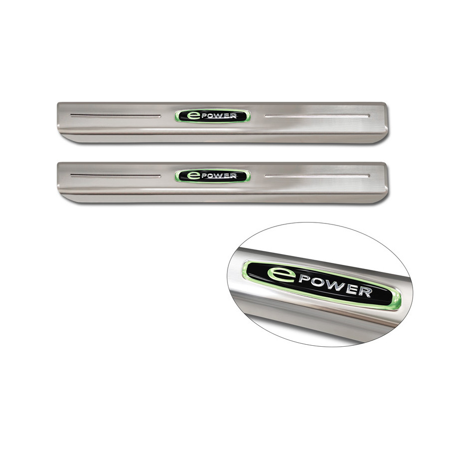 Stainless Steel Door Sill Trims Suitable for Volkswagen ID.Buzz 2022 - 'E-Power' - Set of 2. Door sill trims are the ultimate accessories for protecting your car's sills and adding a luxurious look. These are custom-made for your car, ensuring a perfect fit. They prevent scratches and damage while getting in and out and protect against the elements. With a wide selection of materials and designs, you can give your car a unique look. These door sill trims are easy to attach with the included 3M tape. Specifications: Die-cut lines and green printed 'E-Power' logo. Contents: Set of 4 for both front and rear doors. Color: Black. Material: Stainless steel.