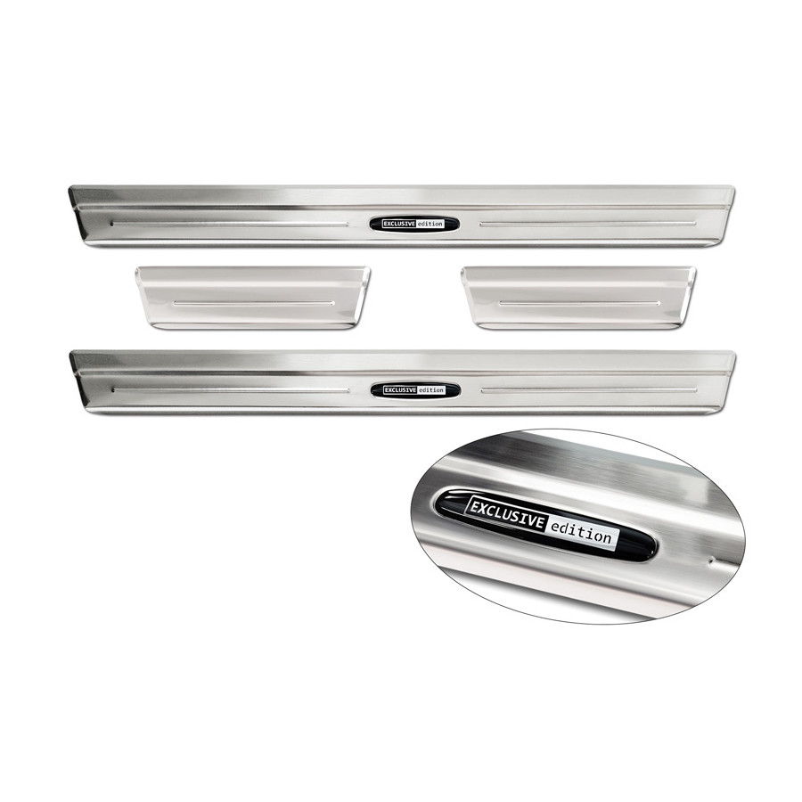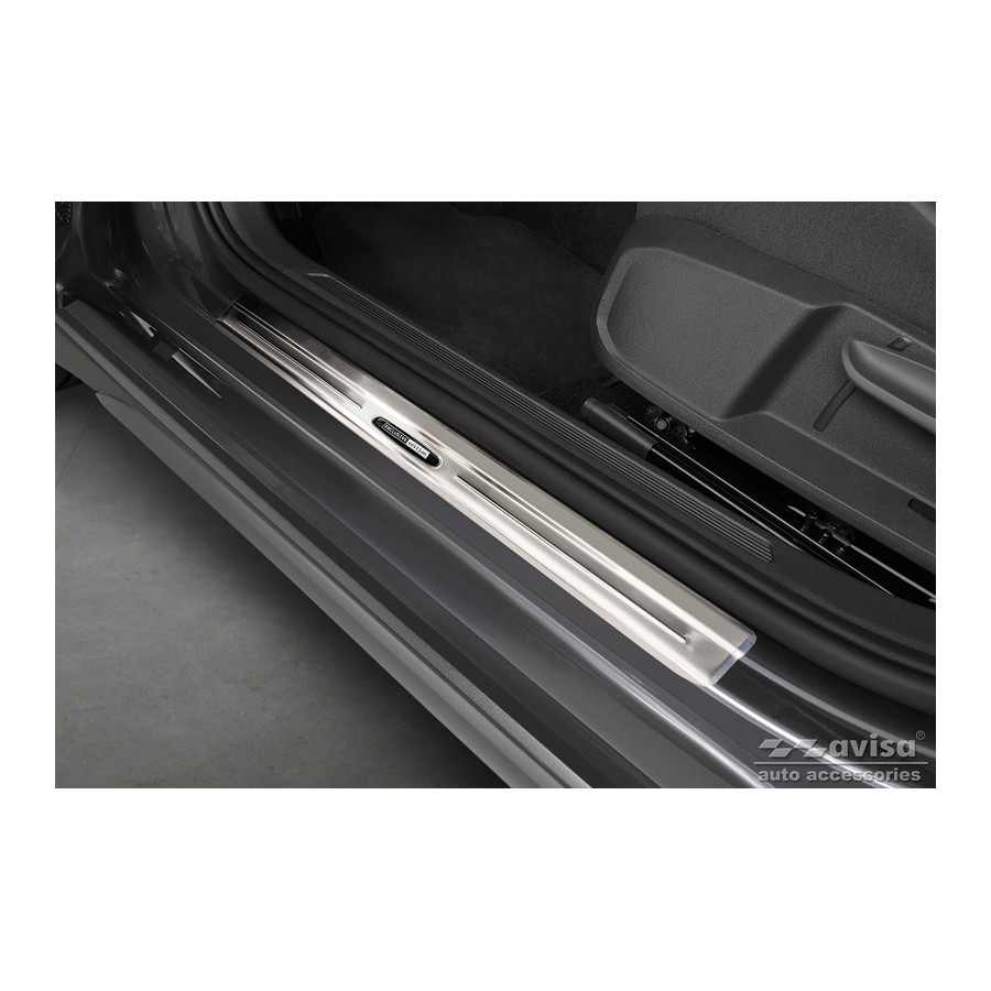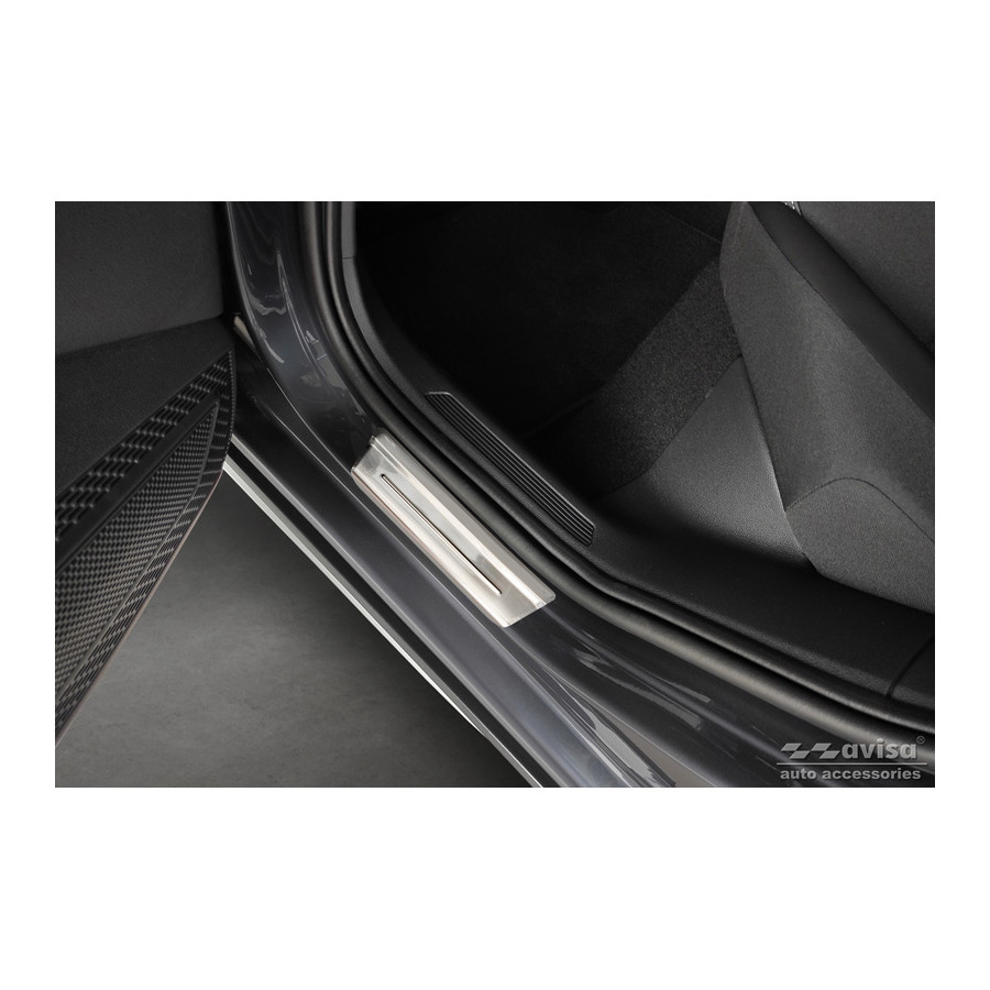 Stainless Steel Door Sill Trims Suitable for Volkswagen Taigo 2021 - 'Exclusive Edition' - Set of 4. Door sill trims are the ultimate accessories for protecting your car's sills and adding a luxurious look. These are custom-made for your car, ensuring a perfect fit. They prevent scratches and damage while getting in and out and protect against the elements. With a wide selection of materials and designs, you can give your car a unique look. These door sill trims are easy to attach using the included 3M tape. Specifications: Additional information: Stamped lines and 'Exclusive Edition' logo. Contents: Set of 4 for both front and rear doors.