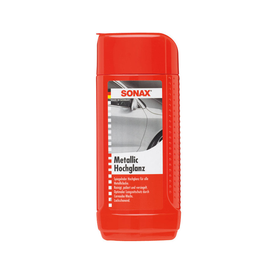 Sonax Metallic High gloss, a mirrored high gloss for all metallic paints. Cleans, polishes and seals the paint surfaces. Especially for metallic paints. Carnauba wax then protects against all weather influences. Optimal durable protection.
