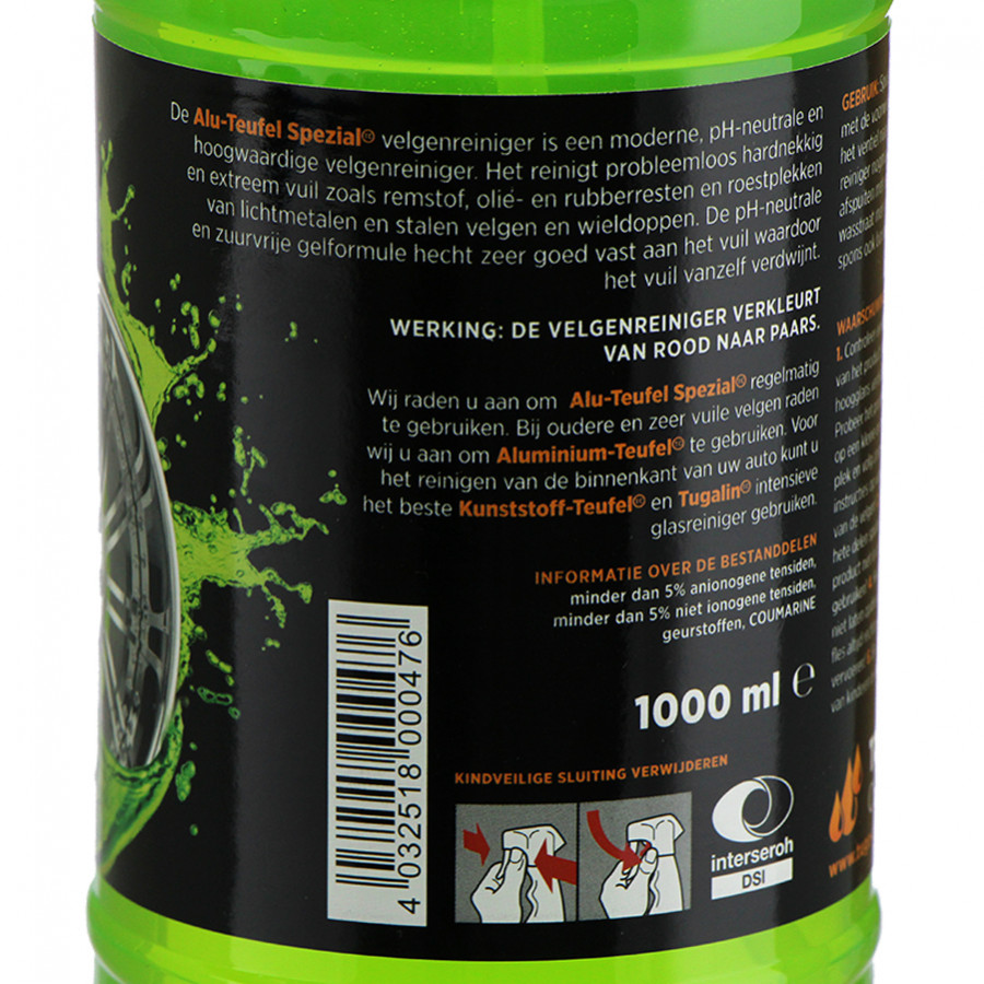 Alu-Teufel Spezial is the special cleaner for new high-gloss chromed, polished or anodised rims. It easily cleans all aluminium rims super clean. A molecular protective layer forms on the rim and prevents the build-up of heavy dirt with regular use. Alu-Teufel Spezial also protects wheel trim rings, heart chromed bumpers and trim strips against rust and is so mild that it does not attack paint, plastic or rubber.