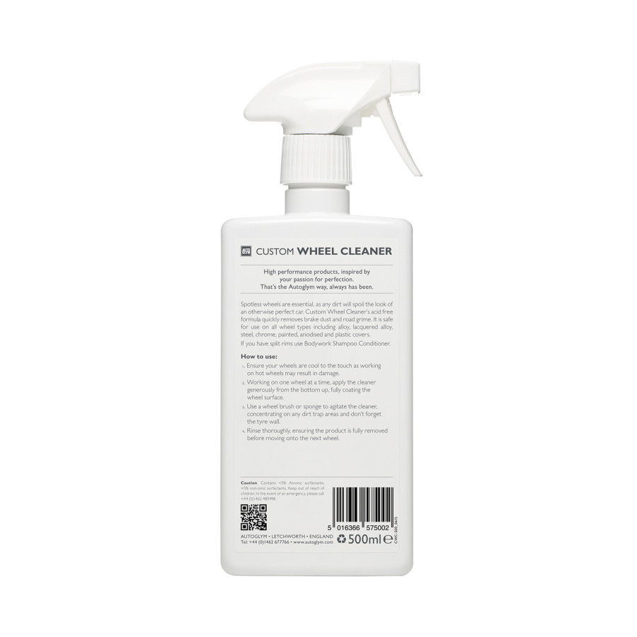 Autoglym Custom Wheel Cleaner is an acid-free formulation of specialist wheel cleaner that quickly removes brake dust and road grime. Specialist Wheel Cleaner is safe to use on all types of wheels including alloy, painted alloy, steel, chrome, painted, anodised and plastic. If you have split wheels use Autoglym Bodywork Shampoo Conditioner.