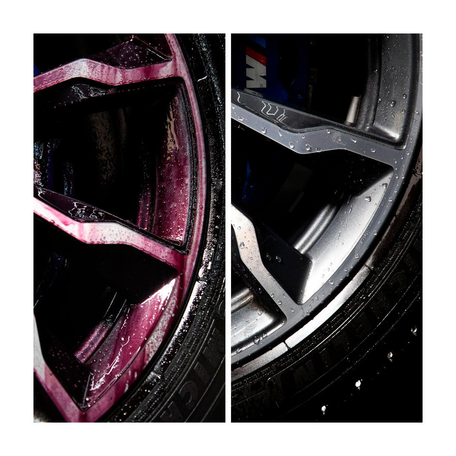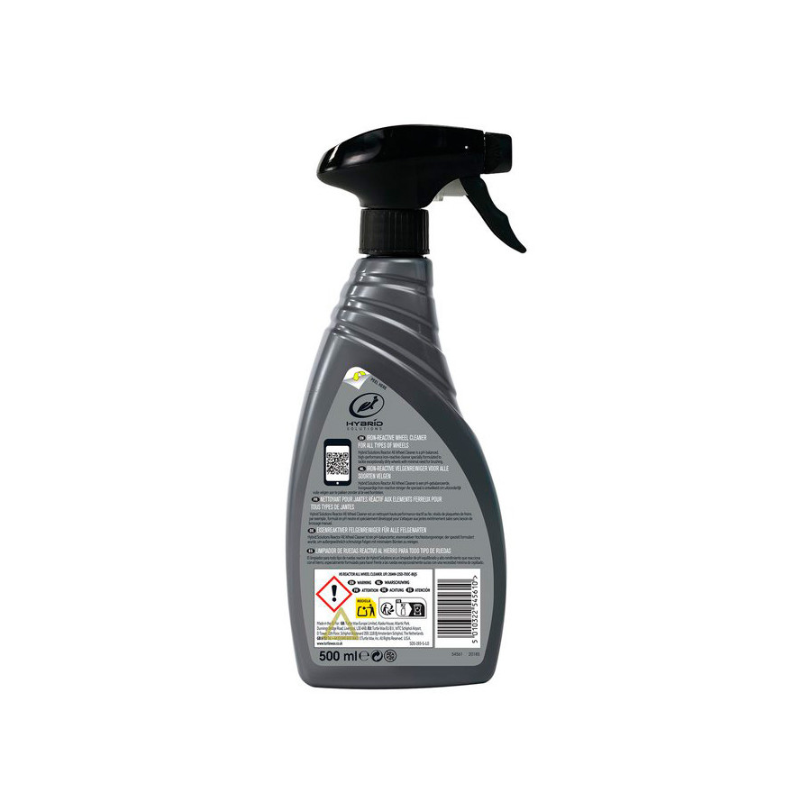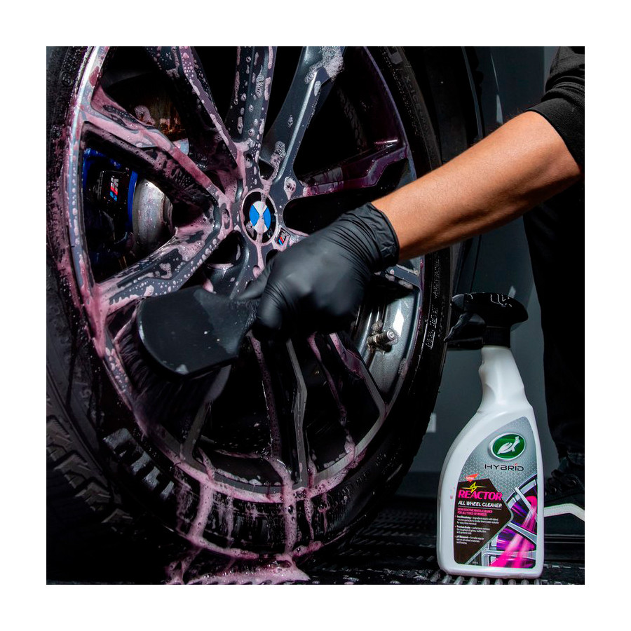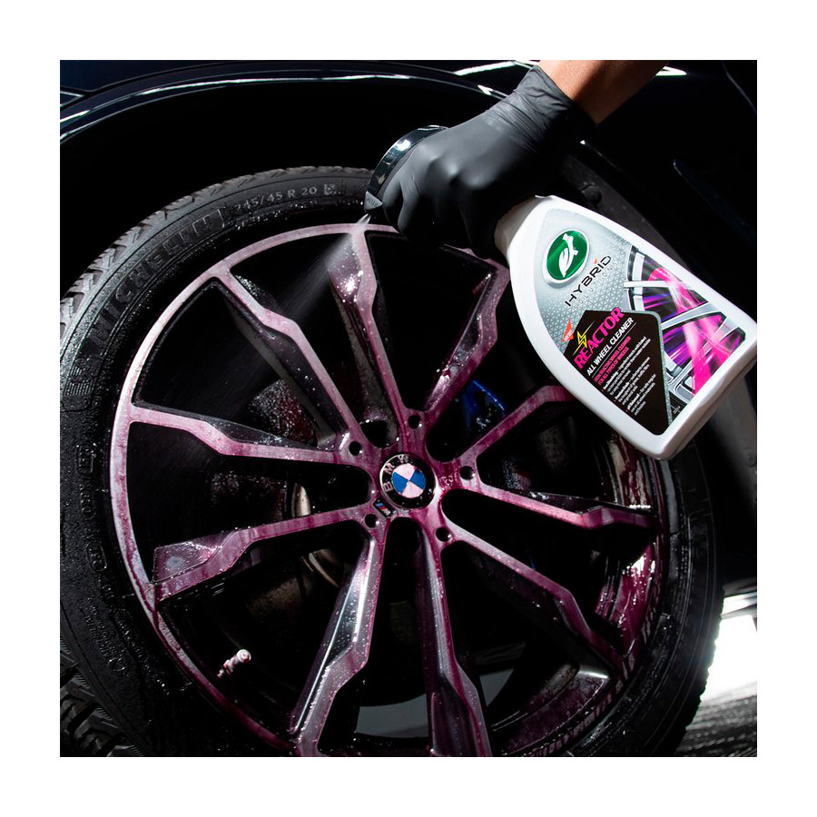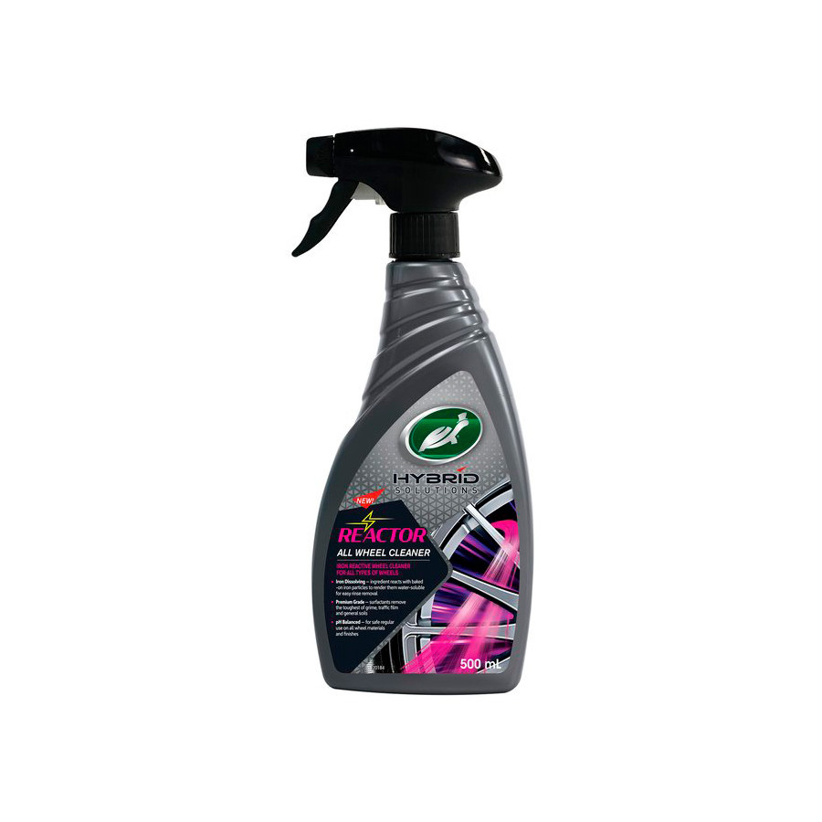 Turtle Wax Hybrid Solutions Reactor All Wheel Cleaner is a pH balanced high performance iron reactive cleaner specially formulated to tackle exceptionally dirty wheels. Turtle Wax Hybrid Solutions Reactor All Wheel Cleaner is for all types of wheels. The iron dissolving ingredient reacts with stubborn brake dust particles to make them water soluble for easy removal after rinsing. The rapid color change provides a visual cue (after 3-5 minutes) that the formula is working and the wheel is ready to be brushed clean and/or rinsed. The Premium Grade surfactants remove the toughest dirt, brake dust and general grime. The odor blocker masks the unwanted aroma of the iron dissolving ingredient. Turtle Tip: Best results are achieved with a pressure washer. Note: Always test on an inconspicuous area of the wheel first, such as the inside of the rim. Do not allow the formula to dry on the wheel