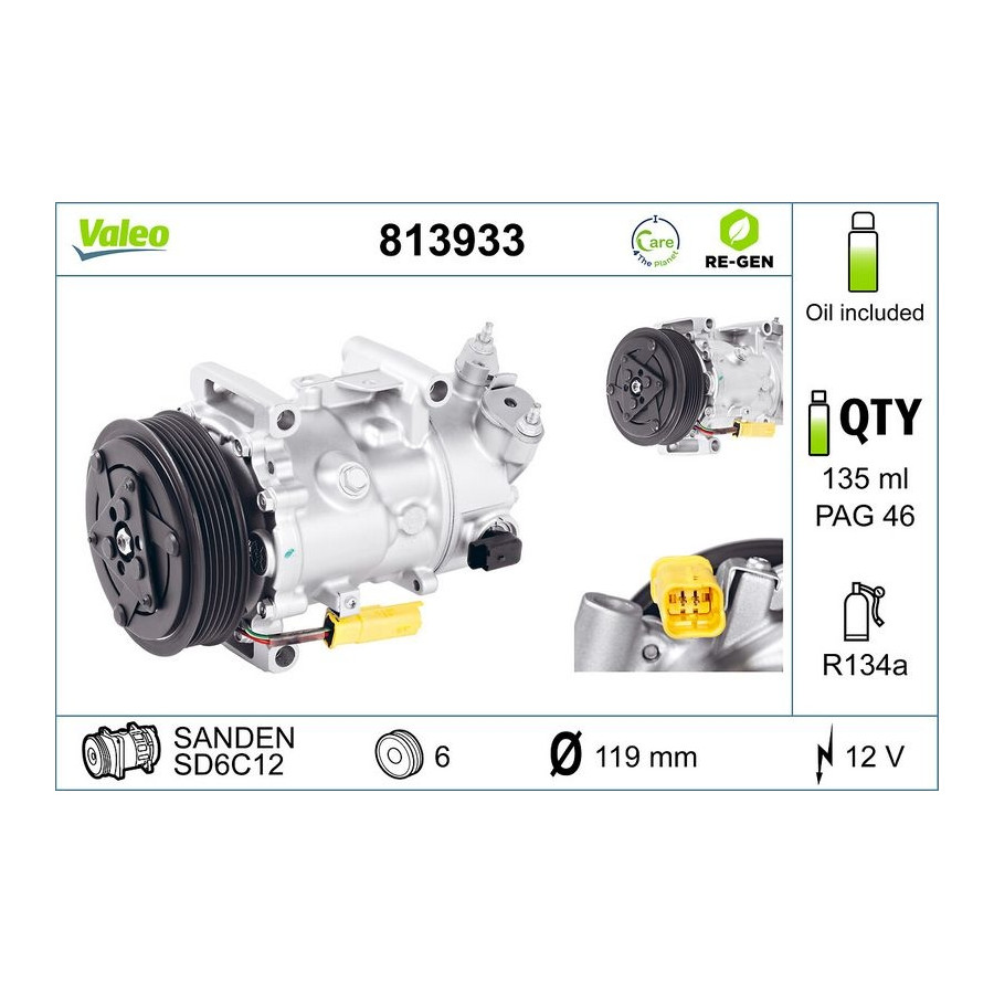 application Air conditioning pump Supplementary Article/Info 2 With PAG compressor oil Voltage [V] 12 Manufacturer Restriction Sanden Belt Pulley Ø [mm] 119 Refrigerant R 134a Compressor ID SD6C12 Number of grooves 6 Oil Fill Quantity [ml] 135 Service exchange part Warranty 2 years Weight [kg] 5,75 Compressor oil PAG 46 Similar products of other manufacturers