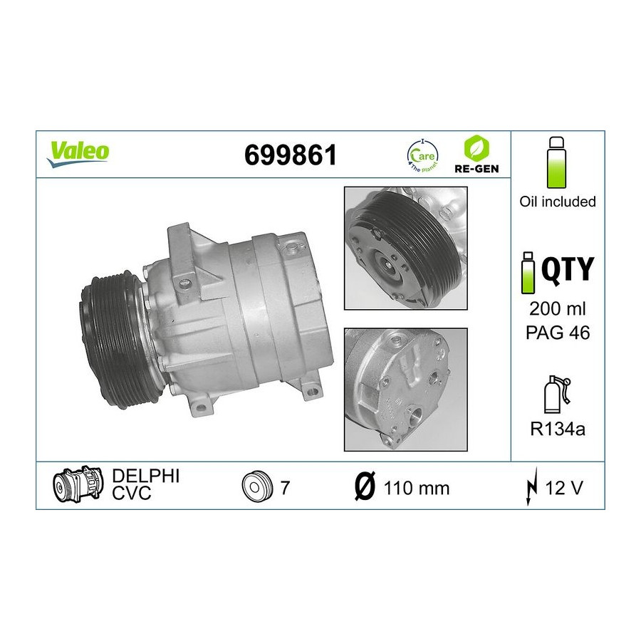 application Air conditioning pump Supplementary Article/Info 2 With PAG compressor oil Voltage [V] 12 Manufacturer Restriction Delphi Belt Pulley Ø [mm] 119 Refrigerant R 134a Compressor ID V5 Number of grooves 7 Capacity Compressor [cc] 151 Oil Fill Quantity [ml] 220 Service exchange part Warranty 2 years Weight [kg] 6,92 Compressor oil PAG 100 Similar products of other manufacturers