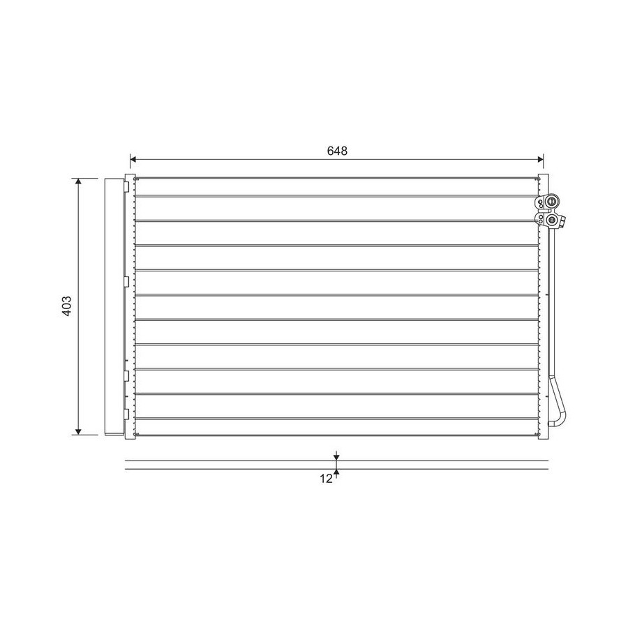 Material Aluminium Supplementary Article/Info 2 Without dryer Refrigerant R 134a Warranty 2 years Core Length [mm] 403 Core Width [mm] 648 Core Depth [mm] 12 Weight [kg] 2,77 Exhaust diameter [mm] 9 Output diameter [mm] 12 Similar products of other manufacturers