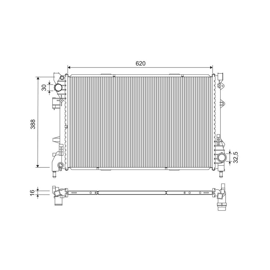 Type Radiator Core Length [mm] 620 Core Width [mm] 388 Material Aluminium Supplementary Article/Info 2 Without thermostat Heating / Cooling For vehicles without oil cooler Housing Type Metal Housing Warranty 2 years Core Depth [mm] 16 Weight [kg] 3,13 Exhaust diameter [mm] 30 Output diameter [mm] 33 -
