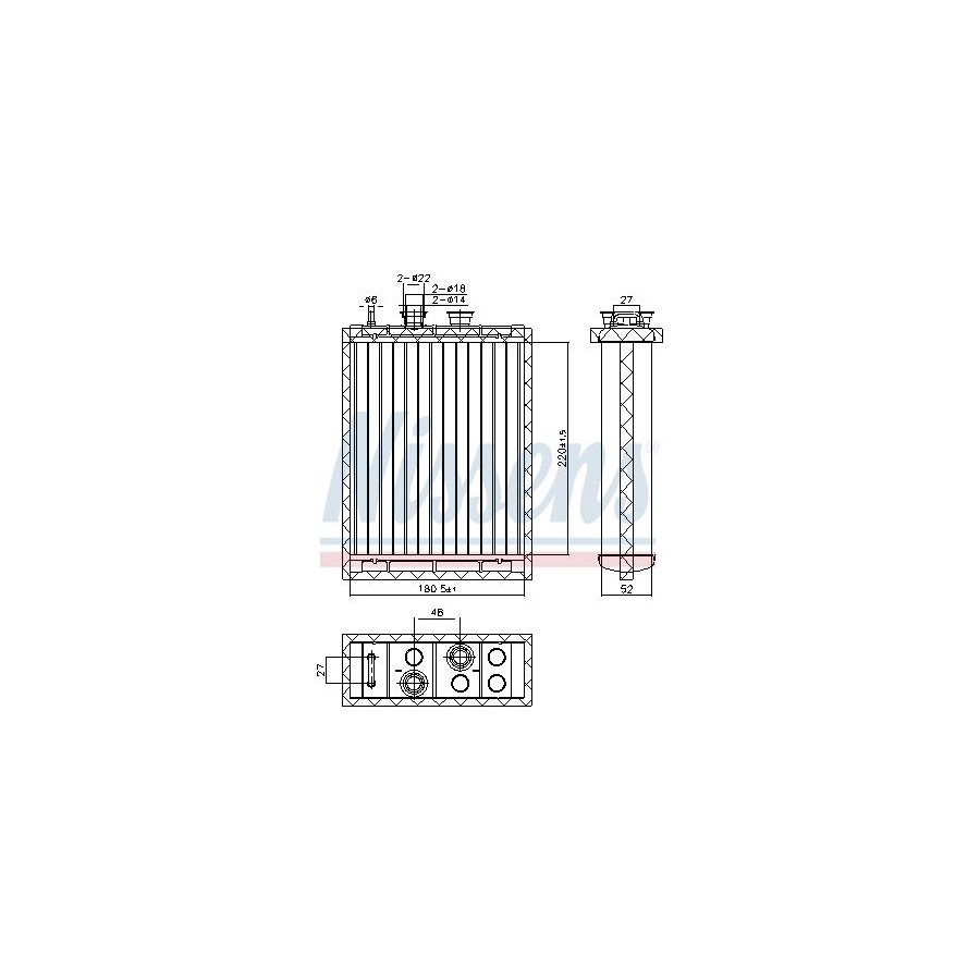 Warranty 2 years Radiator type Soldered cooling fins Cooling Fins Material Aluminium Material tank (radiator) Aluminium Core Length [mm] 220 Core Width [mm] 180 Core Depth [mm] 52 Exhaust diameter [mm] 18,3 Output diameter [mm] 18,3 Similar products of other manufacturers