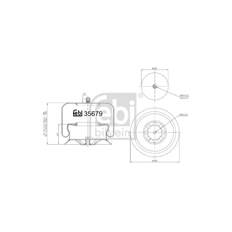 Fitting Position Front Axle Left Front axle right (driver's side) Type Air bellow Outer diameter [mm] 280 155 Supplementary Article/Supplementary Info With piston Warranty 2 years Thickness [mm] 114 197 External Thread Size M24 x 1,5 M16 x 1,5 Unrolling piston material Steel Similar products of other manufacturers