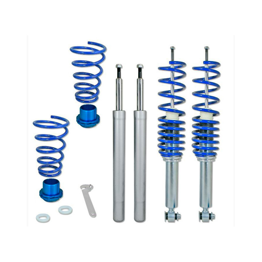 The set is infinitely adjustable in height with the included keys. The shock absorbers are made of galvanized steel and the aluminum dishes. By spraying with a protective oil or spray, the set still remains adjustable after a long time. The screw set has been developed with the best possible price / quality ratio.
