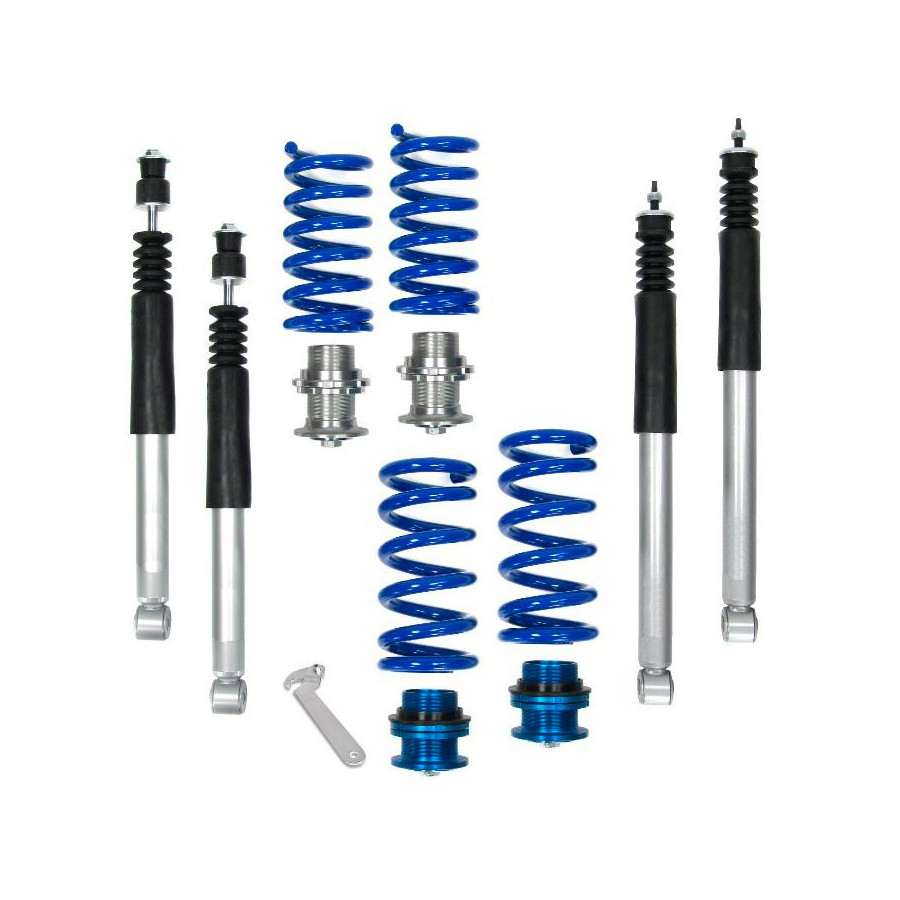 The set is infinitely adjustable in height with the included keys. The shock absorbers are made of galvanized steel and the aluminum dishes. By spraying with a protective oil or spray, the set still remains adjustable after a long time. The screw set has been developed with the best possible price / quality ratio.