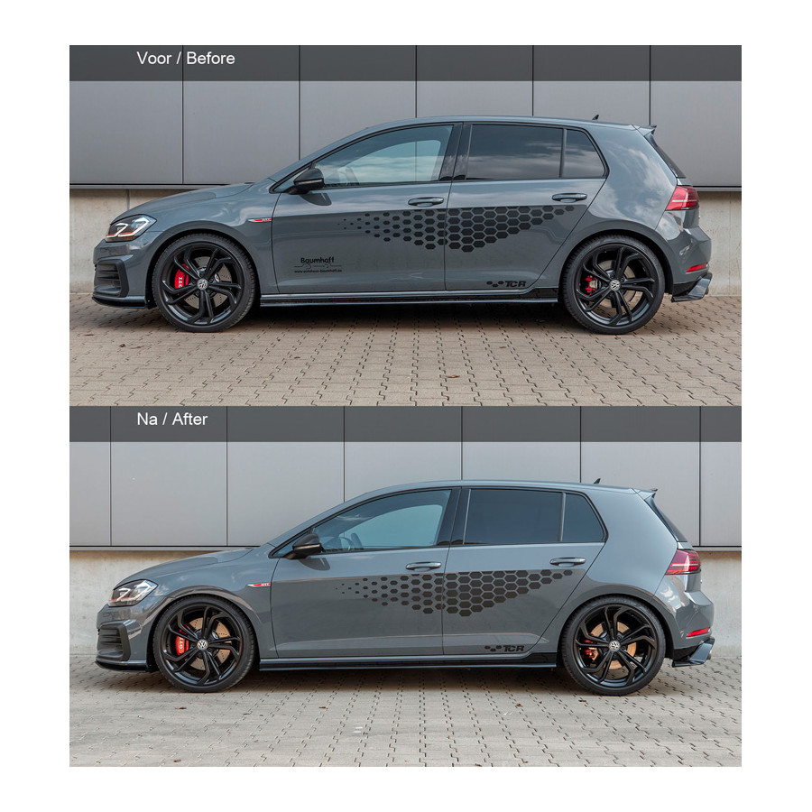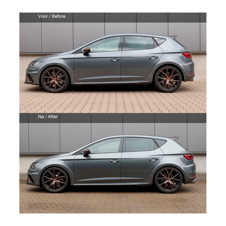H & R uses progressive springs, making the spring a stub section and a comfortable section. This allows a car to remain comfortable without sacrificing sportiness. In addition to springs, H & R also makes complete cupkits that consist of rigid dampers and springs, but also makes H & R screw sets. Unique because the monotube shock absorbers are mounted upside down. As a result, you benefit from a lower weighted weight, which benefits the road position.