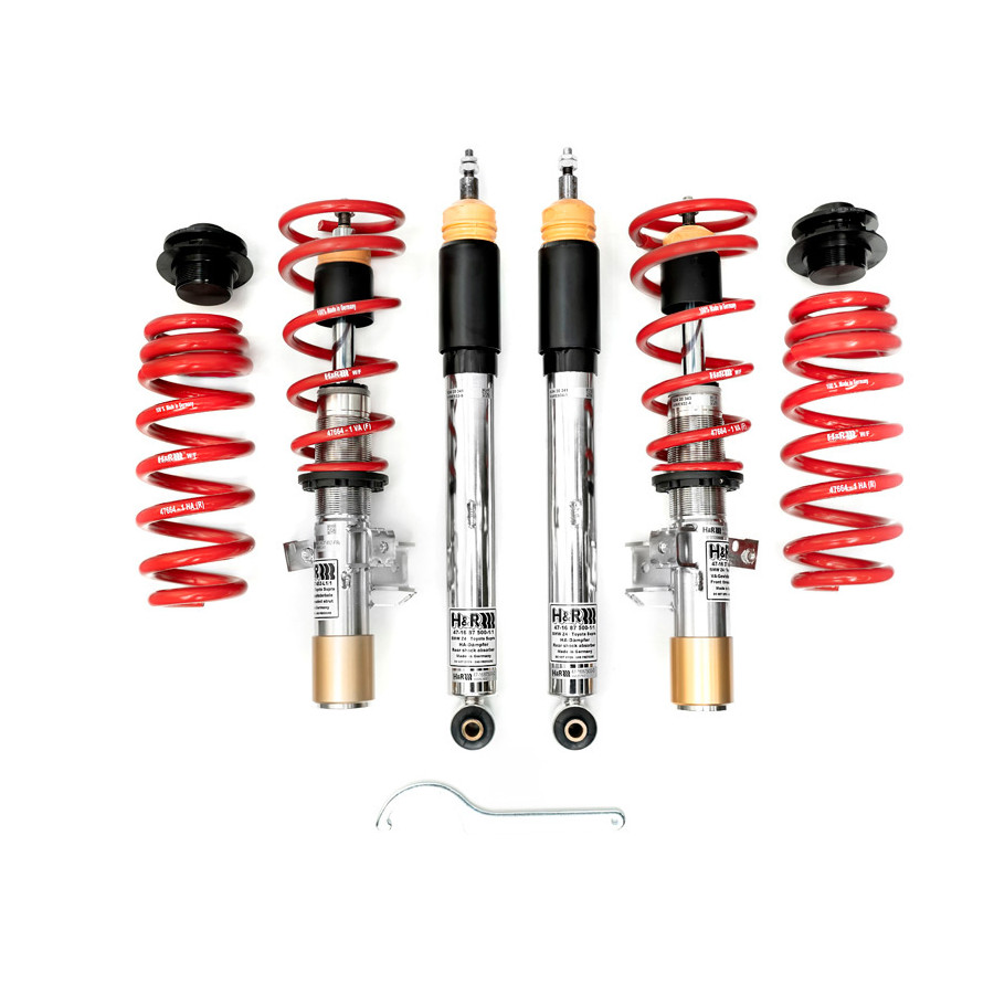 H&R Twin-Tube stainless steel coilovers offer dynamic sporty performance combined with everyday riding comfort. Progressive springs offer the best of both worlds, with a smooth ride during normal driving and a firmer ride for more sporty driving. Available in two versions. Version 1 features fixed-damper shock absorbers paired with matching springs. Version 2, jointly developed with KONI, features adjustable shock absorbers.