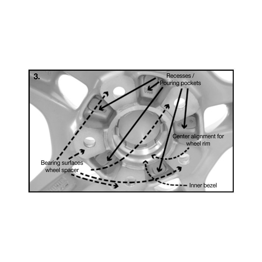 The wheel spacer must be mounted on the axial hub using the supplied mounting bolts. The wheels must then be mounted using the original wheel bolts supplied with the wheels. The length of the original screw protruding from the rim must necessarily be less than the width of the wheel spacer!