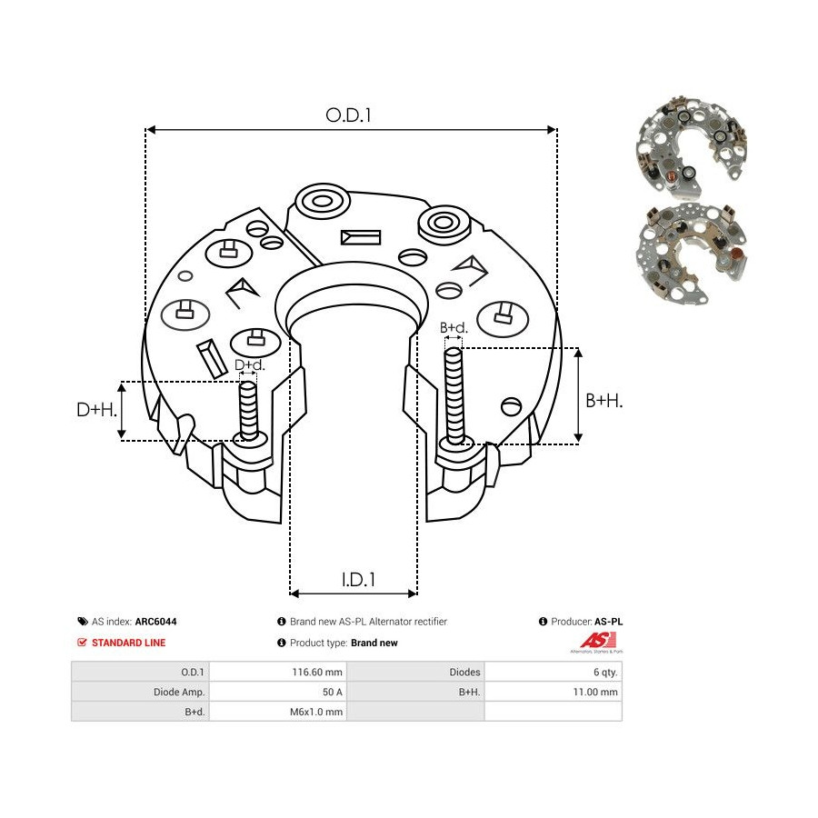 Outer diameter [mm] 116,60 Quality Standard line Warranty 2 years Number of diodes 6 Current [A] 50 New part without deposit Similar products of other manufacturers