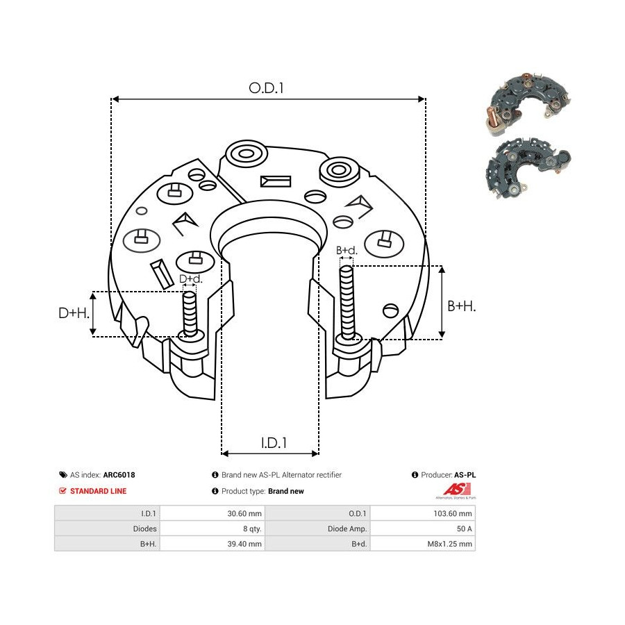 Outer diameter [mm] 103,60 Inner diameter [mm] 30,60 Quality Standard line Warranty 2 years Number of diodes 8 Current [A] 50 New part without deposit -
