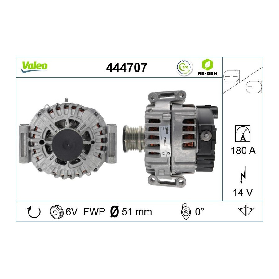 Voltage [V] 14 Number of Ribs 6 Alternator Charge Current [A] 180 Belt Pulley Ø [mm] 51 Pulleys With freewheel belt pulley Rotation Direction Clockwise rotation Clamp B+ Warranty 2 years Method of attachment Direct confirmation Refurbished item Weight [kg] 7,67 Similar products of other manufacturers
