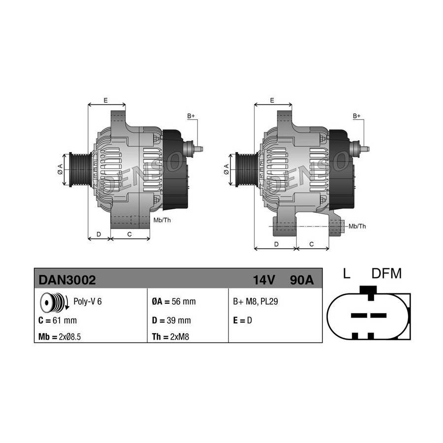 Voltage [V] 14 Number of Ribs 6 Alternator Charge Current [A] 90 Belt Pulley Ø [mm] 56 Pulleys With multi-belt pulley Quality Denso Vehicle Main Current For vehicles with 12V main current Warranty 2 years Gross weight [g] 6150 New part without deposit Similar products of other manufacturers