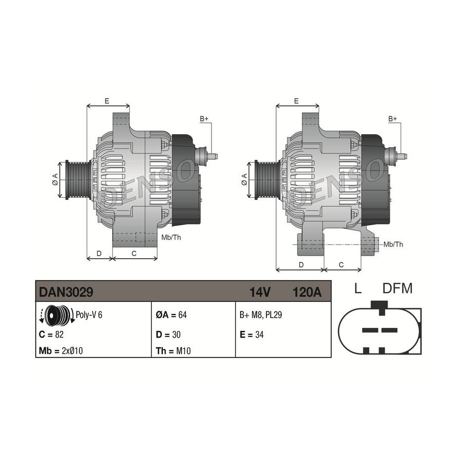 Voltage [V] 14 Number of Ribs 6 Alternator Charge Current [A] 120 Belt Pulley Ø [mm] 64 Pulleys With multi-belt pulley Quality Denso Vehicle Main Current For vehicles with a 12-volt electrical system Warranty 2 years Gross weight [g] 6769 New part without deposit Similar products of other manufacturers