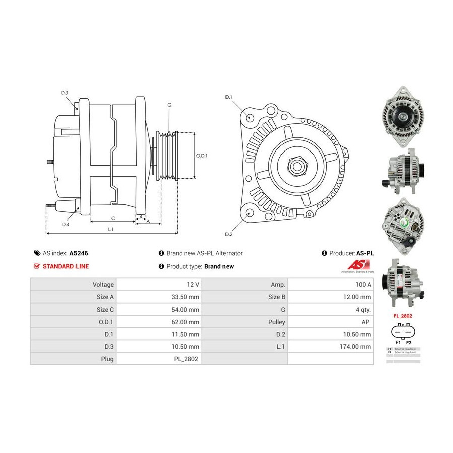 Voltage [V] 12 Alternator Charge Current [A] 100 Pulleys With belt pulley for OE number A2TG0191 Quality Standard line Warranty 2 years New part without deposit Similar products of other manufacturers