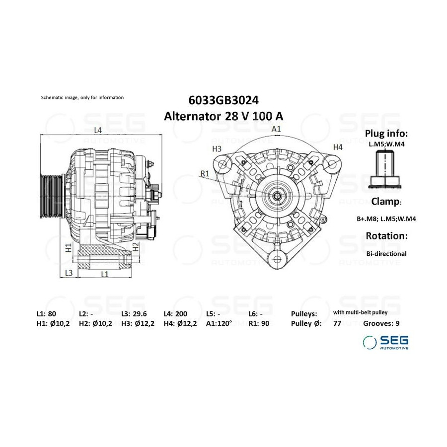 Voltage [V] 28 Alternator Charge Current [A] 100 Belt Pulley Ø [mm] 77 Number of grooves 9 Pulleys With multi-belt pulley Number of mounting bores 3 Position / Degree R120 Rotation Direction Can be used both right and left Clamp B+.M8; L.M5;W.M4 Plug Type ID L.M5;W.M4 Alternator charging current from [A] 15 Warranty 2 years Alternator charge current to [A] 100 application Vehicle specific Length [mm] 200 Category Engine parts and accessories Similar products of other manufacturers