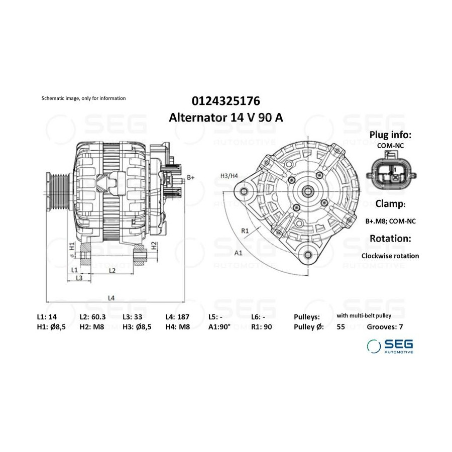 Voltage [V] 14 Alternator Charge Current [A] 90 Belt Pulley Ø [mm] 55 Number of grooves 7 Pulleys With multi-belt pulley Number of mounting bores 2 Position / Degree R90 Rotation Direction Clockwise rotation Clamp B+.M8; COM-NC Plug Type ID COM-NC Alternator charging current from [A] 50 Warranty 2 years Number of Thread Bores 2 Alternator charge current to [A] 90 application Vehicle specific Length [mm] 187 Category Engine parts and accessories Similar products of other manufacturers
