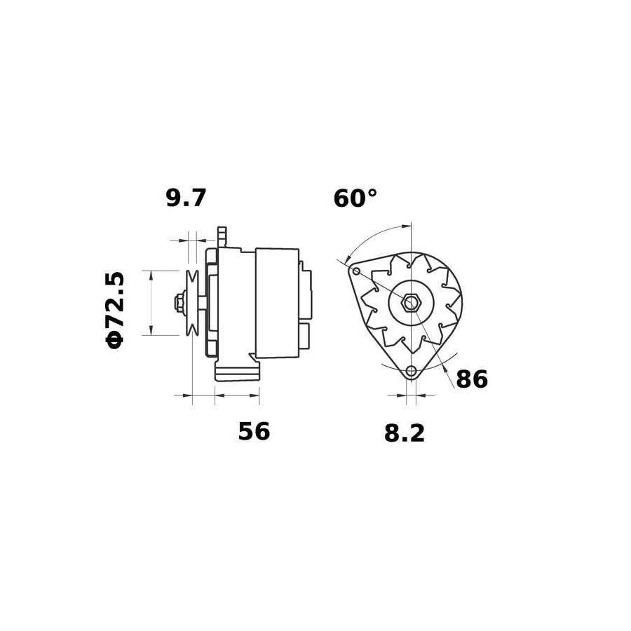 Voltage [V] 14 Number of Ribs 1 Alternator Charge Current [A] 65 Belt Pulley Ø [mm] 68 Pulleys With belt pulley Mounting points diameter [mm] 86,0 Mounting bores distance [mm] 56,0 Number of mounting bores 1 Distance from pulley to alternator [mm] 21,0 Number of belts 1 Rotation Direction Clockwise rotation Packaging length [cm] 24,8 Packaging width [cm] 18,60 Packaging height [cm] 17,50 Warranty 2 years Net Weight [g] 4596 Hole diameter [mm] 8,2 Similar products of other manufacturers