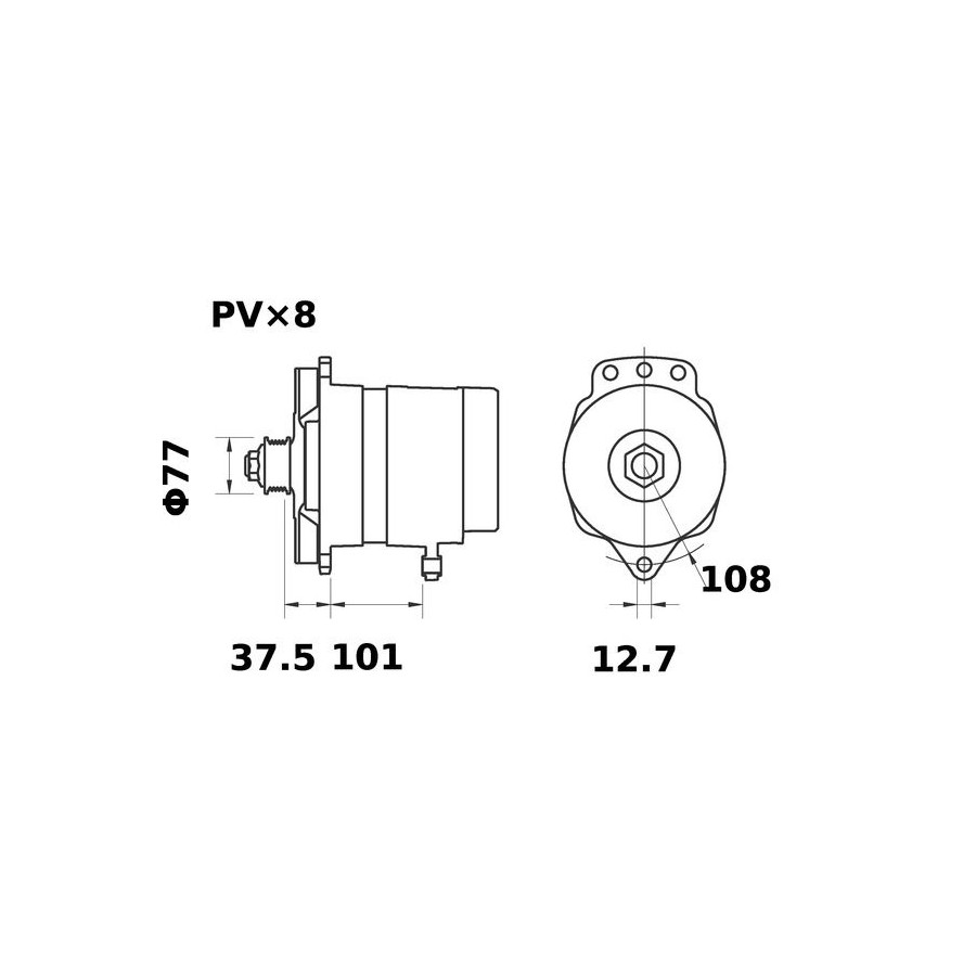 Voltage [V] 14 Number of Ribs 8 Alternator Charge Current [A] 270 Belt Pulley Ø [mm] 77 Pulleys With v-ribbed belt pulley Mounting points diameter [mm] 108,0 Mounting bores distance [mm] 102,0 Distance from pulley to alternator [mm] 37,5 Number of belts 8 Rotation Direction Can be used both right and left Packaging length [cm] 30,5 Packaging width [cm] 23,00 Packaging height [cm] 20,50 Warranty 2 years Dust Cover With dust cover Net Weight [g] 14128 Hole diameter [mm] 12,7 Similar products of other manufacturers