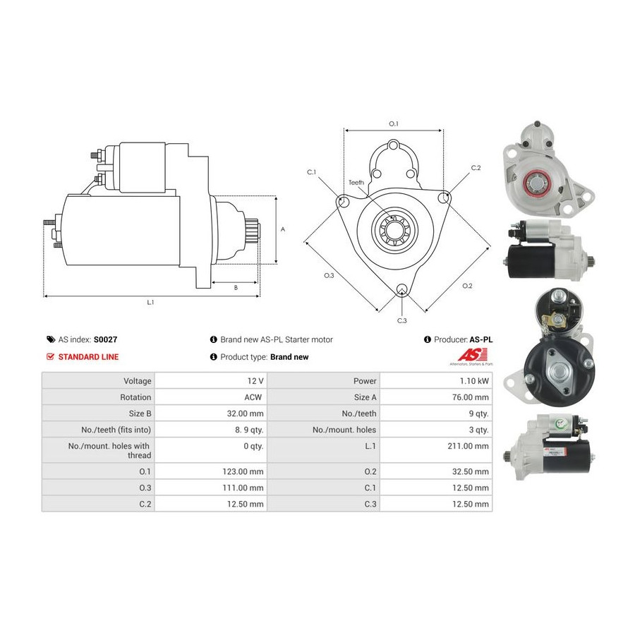 Number of Teeth 9 Number of mounting bores 3 Rotation Direction Anti-clockwise rotation Starter motor power [kW] 1,1 Voltage [V] 12 for OE number 0001121006 Quality Standard line Warranty 2 years New part without deposit Similar products of other manufacturers