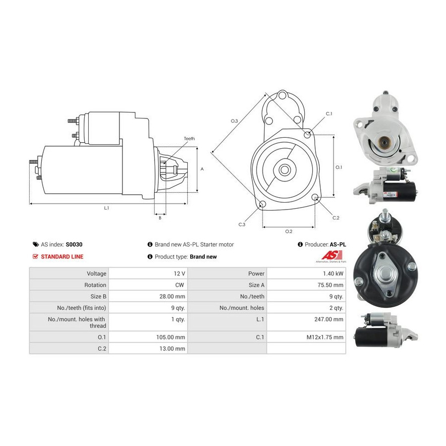 Number of Teeth 9 Number of mounting bores 2 Rotation Direction Clockwise rotation Starter motor power [kW] 1,4 Voltage [V] 12 for OE number 0001108113 Quality Standard line Warranty 2 years New part without deposit Similar products of other manufacturers