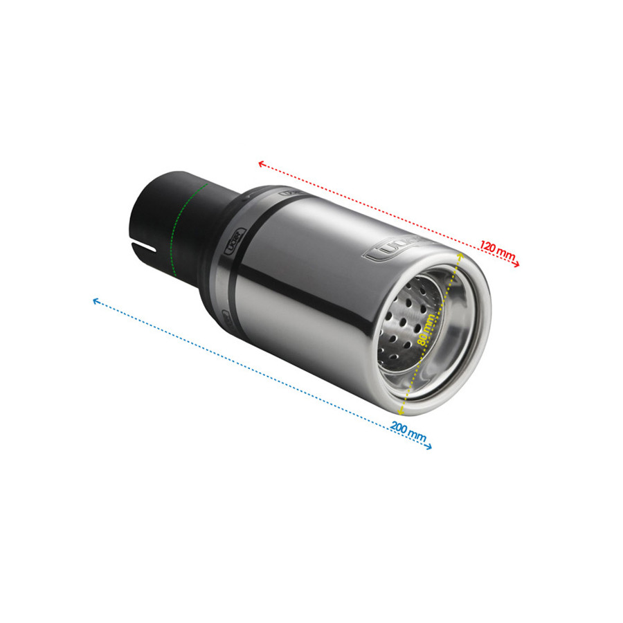 This is a decorative piece for the exhaust system. The total length of the decorative piece is 120mm and the diameter of the end is 80mm. Mounting is done via clamping attachment and can be mounted on an exhaust system with a mounting size of 50mm.