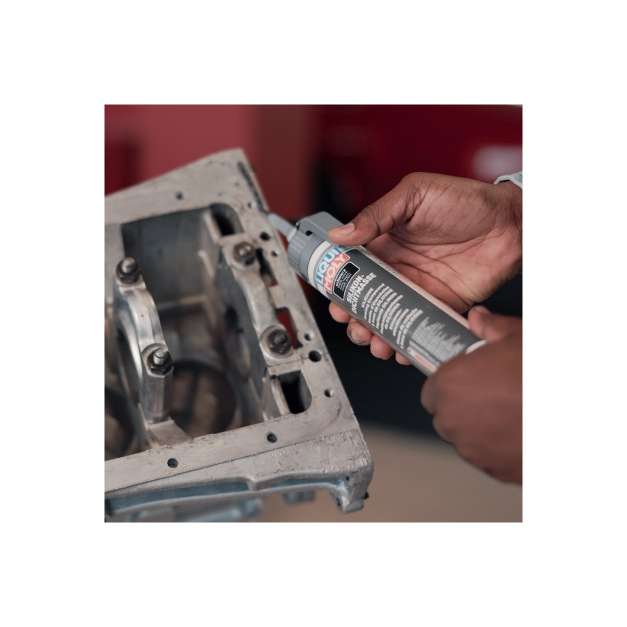 Fine silicone gasket. This is on a neutral/oxime basis, does not eat aluminum. Works perfectly, also for the somewhat larger gaps of 2mm such as between the crankcase and the intake manifold of a V8 engine. Is also slightly stiffer than regular silicone gasket on a vinegar acetoxy basis.