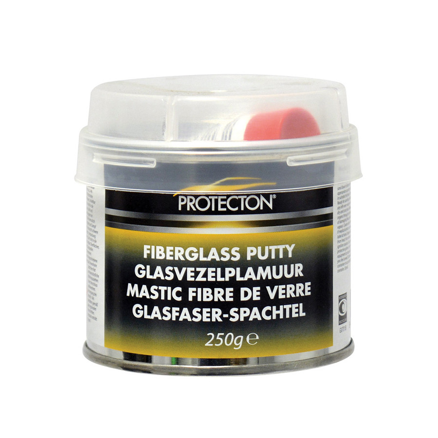 Protecton fiberglass filler with hardener is designed for repairing larger dents, holes, and cracks. Fiberglass filler adheres to metal, wood, concrete, and plastic. Protecton filler is easy to sand and can be overpainted with all paint systems. Fiberglass filler has very high filling power and high impact resistance, and is resistant to chemicals and weather influences. Protecton fiberglass filler can be applied in layers up to 2 centimeters thick. Fiberglass filler comes in a 250-gram can and includes an 8-gram tube of hardener.