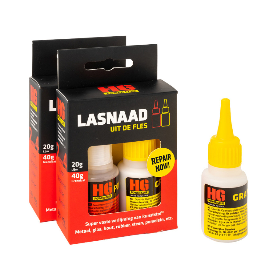 Two components for maximum grip but not a two-component adhesiveThe weld sealant from the bottle is supplied in two bottles. One contains the extremely strong industrial adhesive HG-Extreme 1.0, the other the specially formulated granulate. Only the combination of the two components creates a chemical reaction that produces an indescribable adhesive strength. Using the granulate, broken parts or threads can be reshaped and even ground.