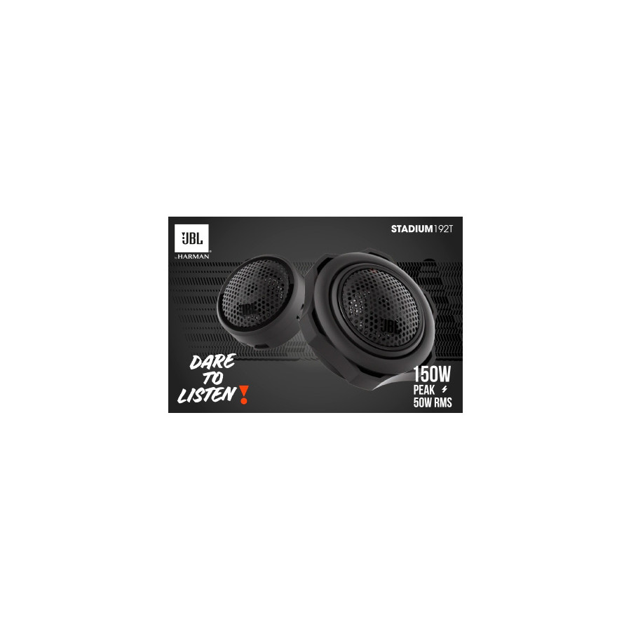 The JBL Stadium 192T Tweeters help add a new dimension to your music, thanks to their edge-driven aluminum dome that improves sound dispersion and delivers natural-sounding highs. Ultra-compact inline crossovers direct the correct frequencies to these tweeters, making them a little easier to install.