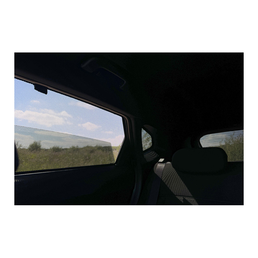 Set of ready-made Car Shades sun blinds, perfect during the beautiful summer weather, long holiday trips and especially for your passengers. The sun blinds keep the bright sun outside and due to the specially woven cloth structure they give your car a nice discreet appearance, your windows get the look of tinted windows. You simply click the Car Shades between your window frames and remove them just as easily.