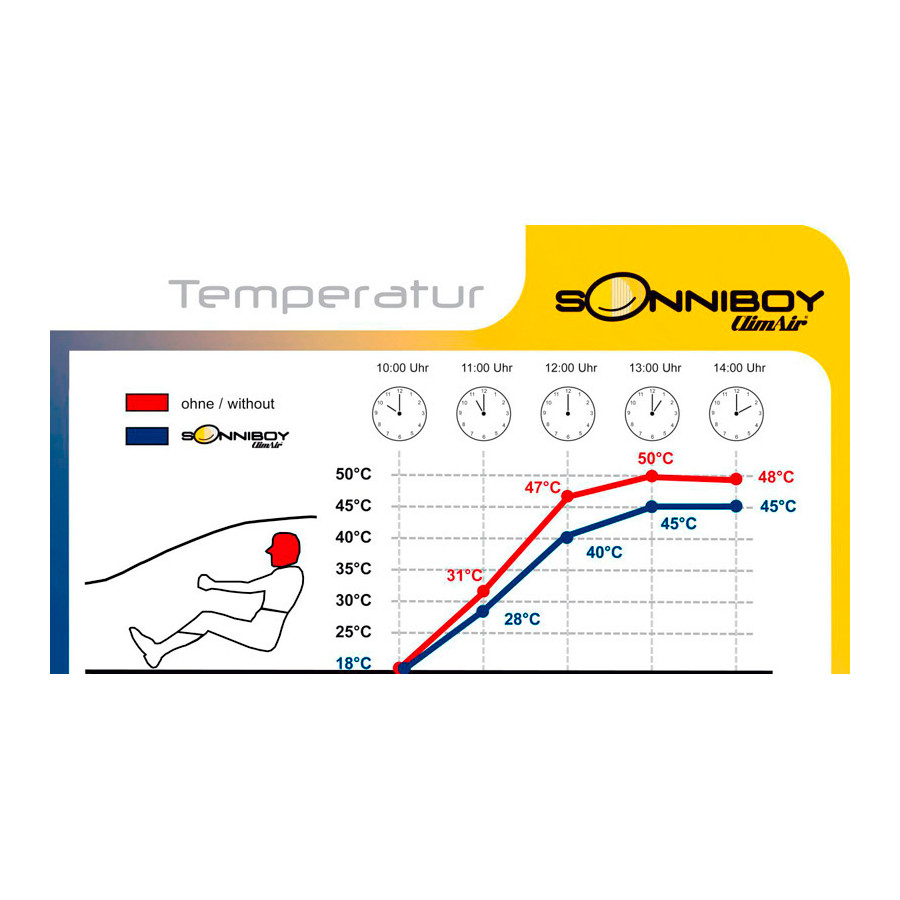 You simply click this ClimAir Sonniboy car sunblind between your window styles and remove them just as easily. They are the perfect alternative to window film, sun blinds and expensive privacy glass because they combine everything in 1. The Sonniboy Shades keep the sun out, you can just drive with your window open. This way you can let the cool wind in during the warm weather. Even with a completely open window, sun rays and insects have no chance to penetrate. In cars without air conditioning, it is an indispensable solution against the sun and heat. Each set of Sonniboy Shades consists of ready-made sunshades for all windows from the B-pillar.