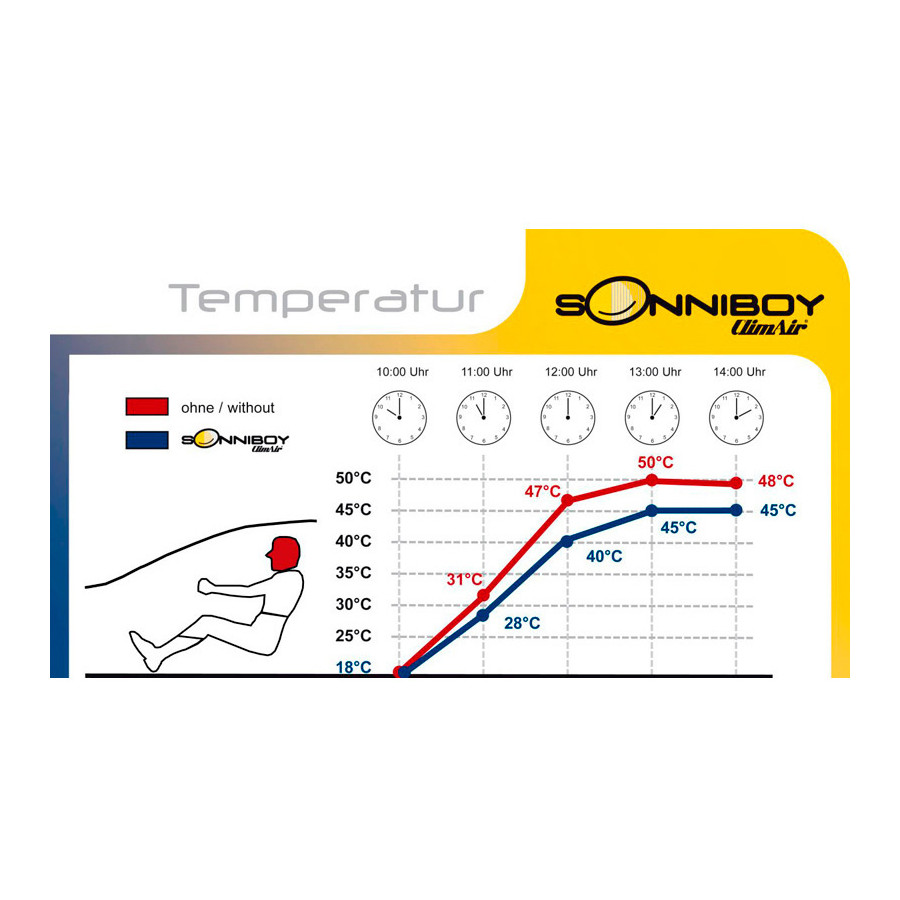 You simply click this ClimAir Sonniboy car sunblind between your window styles and remove them just as easily. They are the perfect alternative to window film, sun blinds and expensive privacy glass because they combine everything in 1. The Sonniboy Shades keep the sun out, you can just drive with your window open. This way you can let the cool wind in during the warm weather. Even with a completely open window, sun rays and insects have no chance to penetrate. In cars without air conditioning, it is an indispensable solution against the sun and heat. Each set of Sonniboy Shades consists of ready-made sunshades for all windows from the B-pillar.