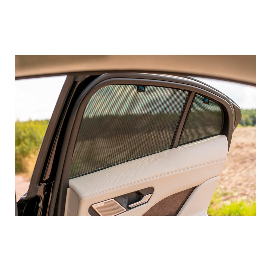 Set of ready-made Car Shades sunblinds for the rear doors, perfect during the beautiful summer weather, long holiday trips and especially for your passengers. The sunshades keep the bright sun out and the specially woven fabric structure gives your car a nice discreet appearance, your windows get the look of tinted windows. You simply click the Car Shades between your window styles and remove them just as easily.