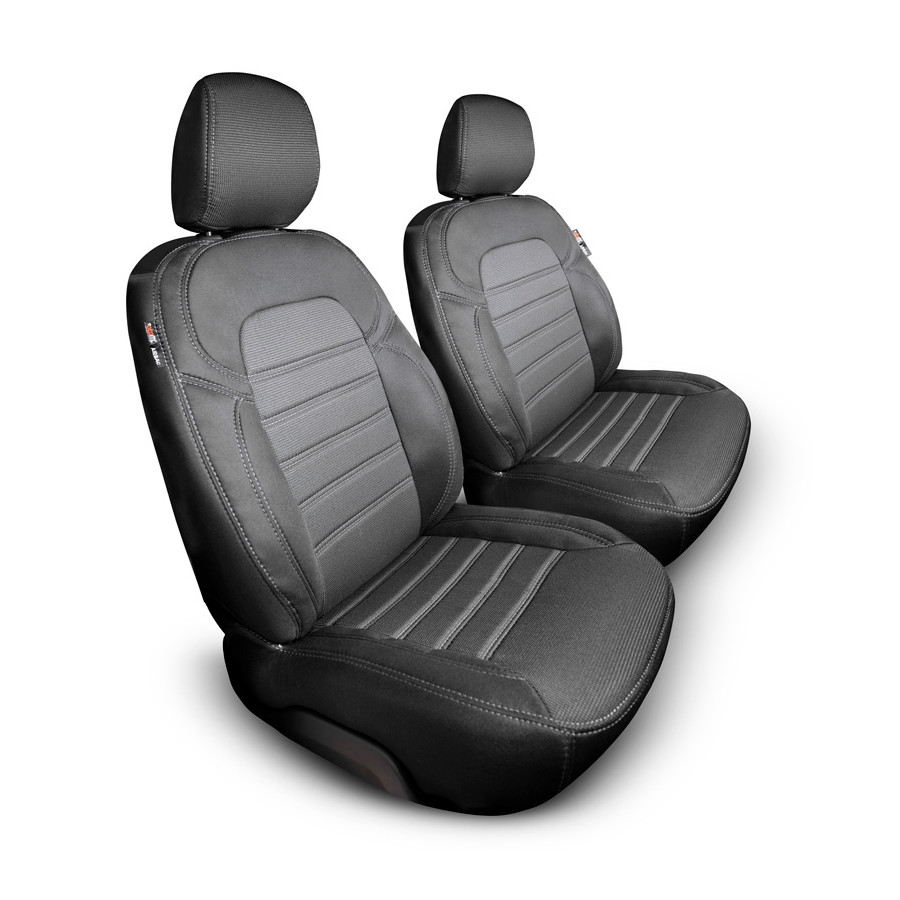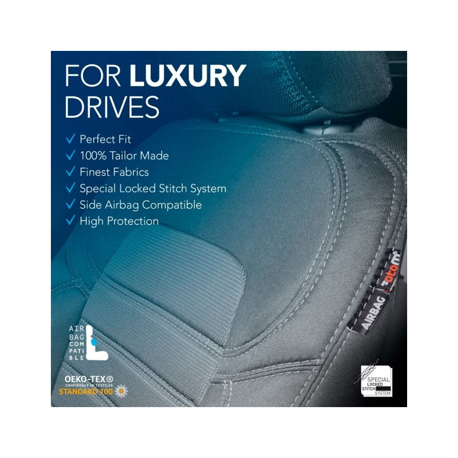 Original Design ready-made fabric seat covers are of high quality and have a 100% fit. Advanced CNC production techniques guarantee a perfect fit and ensure that the car interior looks like the original upholstery after installation. The Original Design sets are made of a combination of stitched jacquard (seat area) and Lacoste (sides/back) upholstery fabrics in a black color, finished with gray stitching. Due to the special stitching technique, the covers are suitable for the normal functioning of the original airbag. In addition to the perfect fit, these sets offer optimum seating comfort and durable protection of your original upholstery against wear, discoloration and/or pollution.