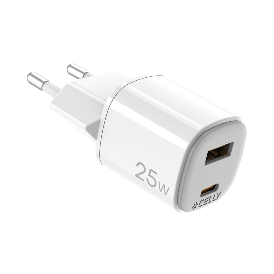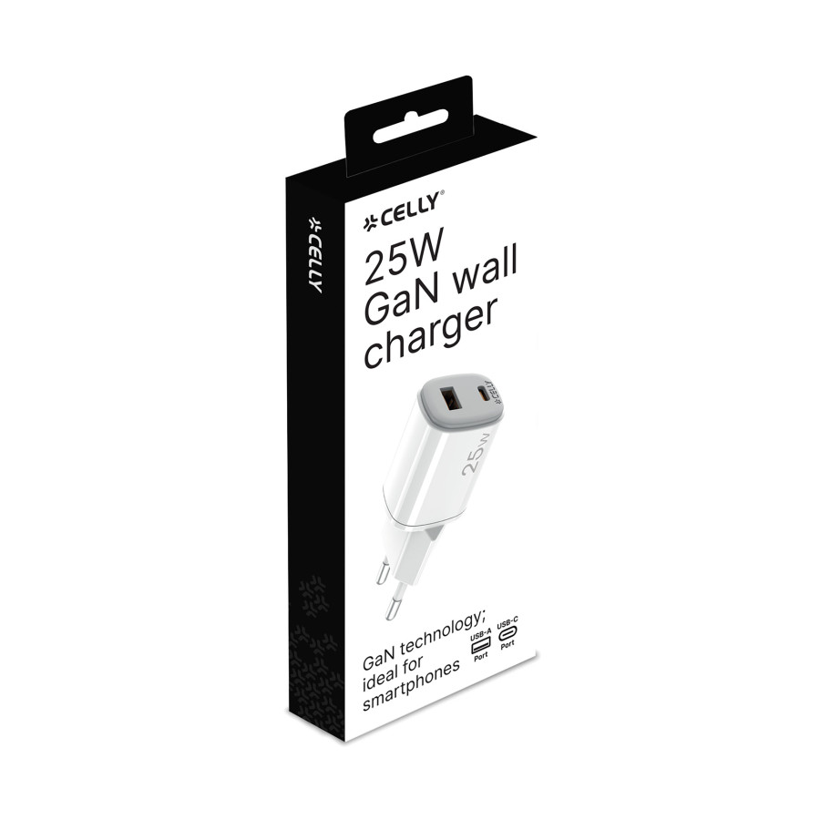 Celly's new UPTC charger series is designed to give your smartphone more charging power. The 25-watt Celly UPTC home charger has both a USB-C and a USB-A port and can be used to charge various devices such as smartphones, tablets, and smartwatches. GaN technology delivers faster charging in a more compact design, optimizes efficiency, and reduces heat generation for an advanced and efficient charging experience. The transparent protective film keeps the charger pristine until you're ready to use it.
