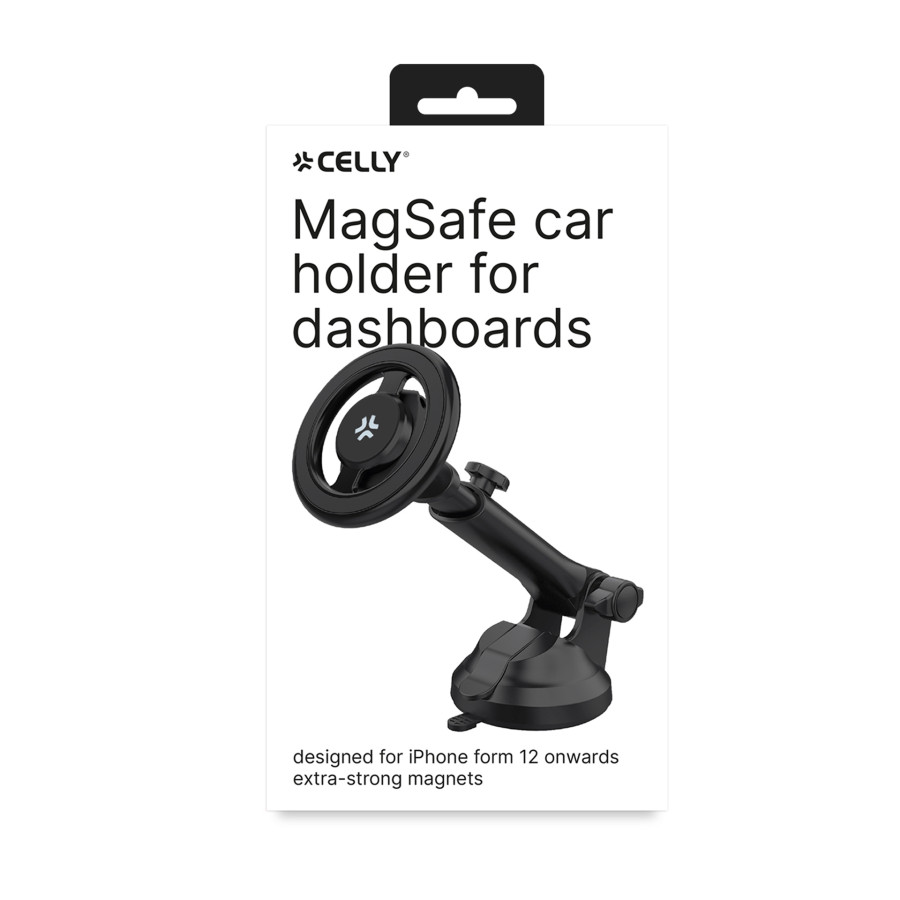 The Celly GhostMagProDS is a magnetic car phone holder for the dashboard and/or windshield, compatible with the Magsafe magnetic alignment present in the latest iPhone models, from iPhone 12. Its new design with a plastic structure provides more stability and sturdiness. When you place your iPhone on the holder, the circular magnet will automatically attach to the magnetic module of the device and lock it securely in place. Thanks to the super strong suction cup, you can securely attach the GhostMagProDS to your dashboard.
