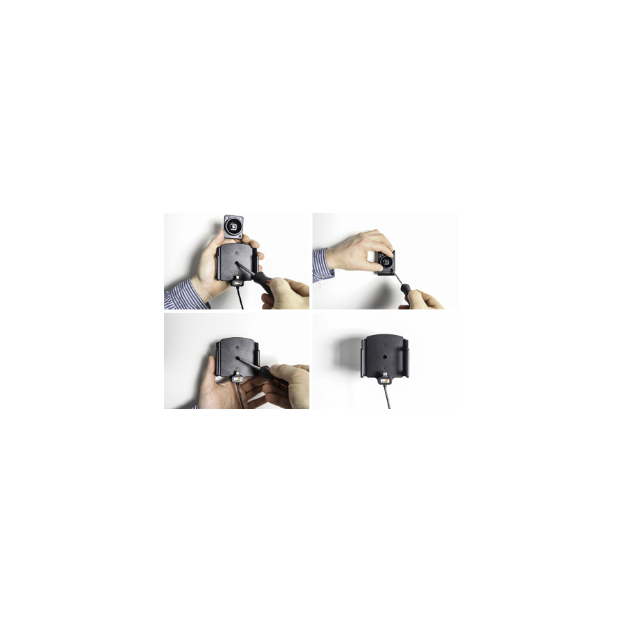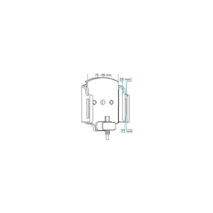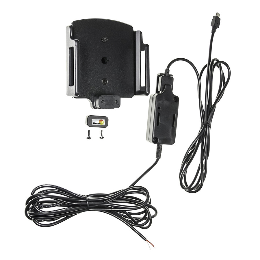 Adjustable holder with Micro USB connector. Fits devices with and without skin with the following dimensions: Width: 75-89 mm, Thickness: 12-16 mm. 2.1A charger. 12 / 24V. With tilt swivel.