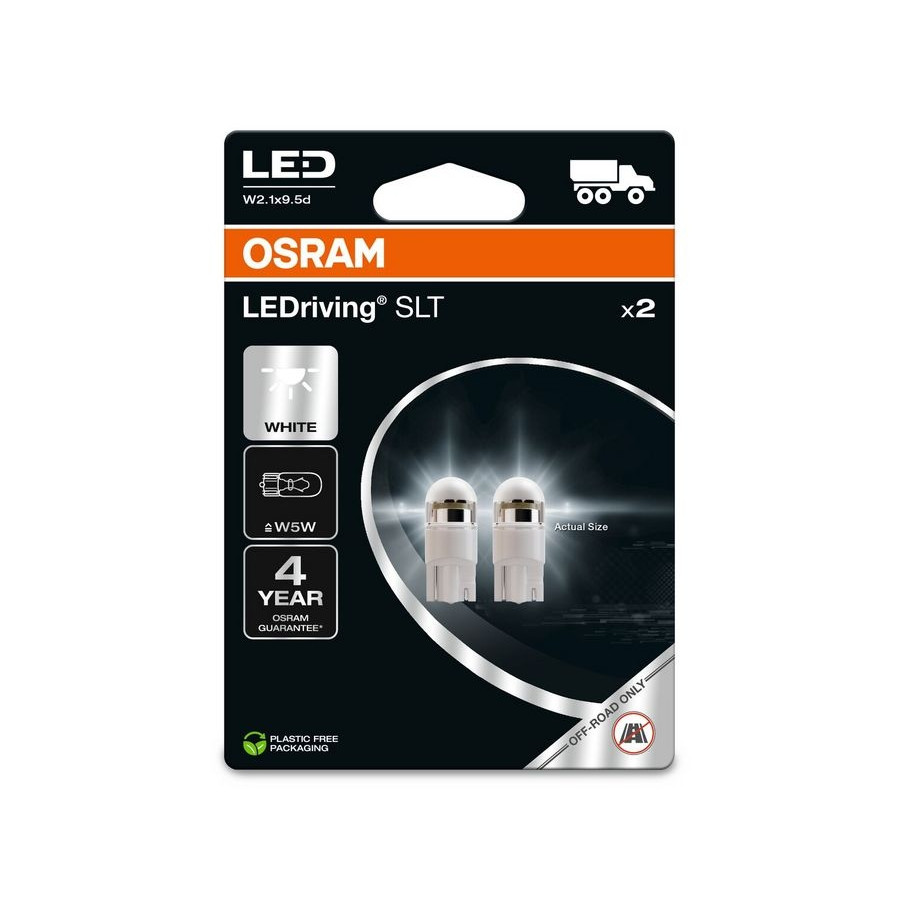 LEDriving SLT W5W replacement lamps offer a modern and intense light with a cool white color temperature up to 6000 Kelvin. These replacement lamps are suitable for all conventional W5W bases. Compared to standard lamps, these LED retrofit lamps consume up to 80% less energy. OSRAM offers a 4-year warranty on these LEDriving SLT lamps. These products are not ECE-approved and may not be used outdoors on public roads.
