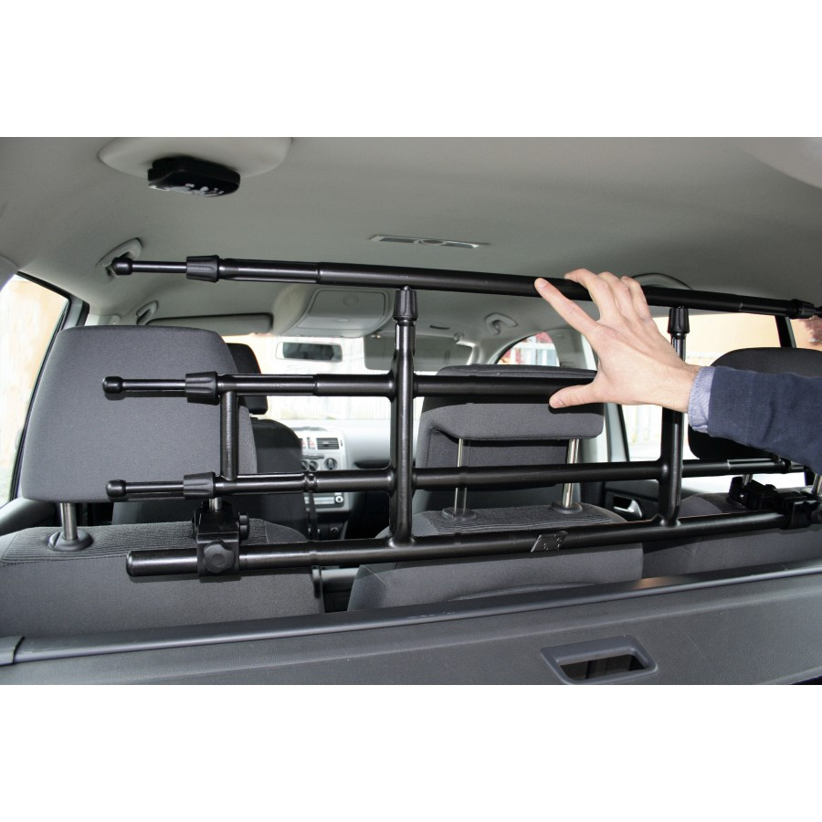A fully pre- assembled Easy-System dog guard. With only 2 clamps, it fits directly behind the front seats or after the rear seat. This makes it also suitable for cars without a bench but with seats in the back. (VW Touran, Renault Scenic etc) This makes this dog guard suitable for all cars with an interior space of 85 cm or more. The G3 Universal Dog Guard 'Pratico' is made of coated steel, universally applicable and is attached to the headrest.