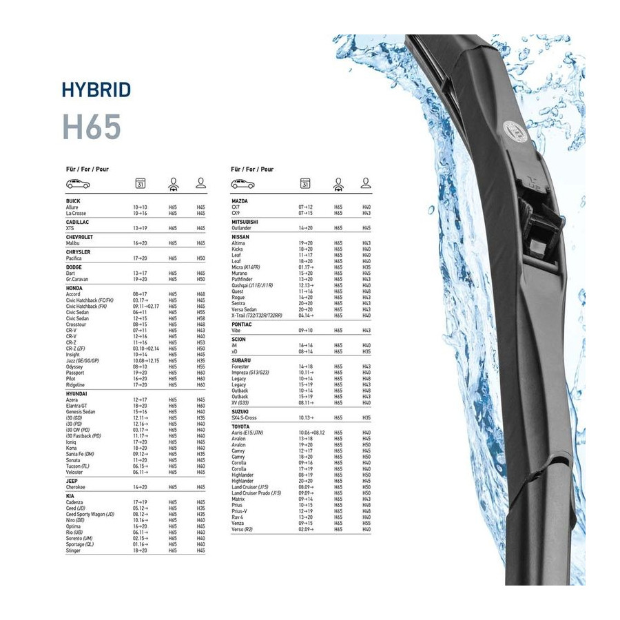Length [mm] 650 Fitting Position Front Quantity 1 Wiper blade type Hybrid wiper blade Length [in] 26 Warranty 2 years Left / right steering For left-hand drive vehicles Assy./disassy. by qualified personnel required! -
