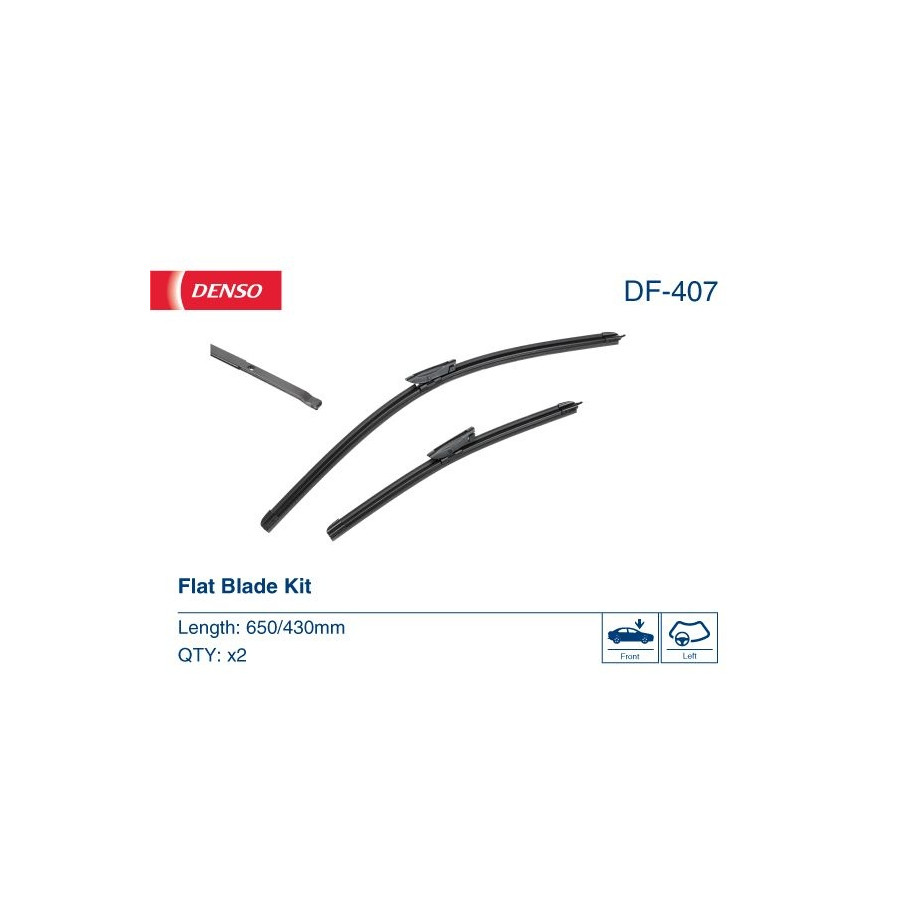 Length [mm] 650 / 430 650 430 Fitting Position Front left and right Quantity Unit Kit Wiper blade type Flat wiper blade Weight [g] 251 Warranty 2 years Left / right steering For left-hand drive vehicles Gross weight [g] 354 -